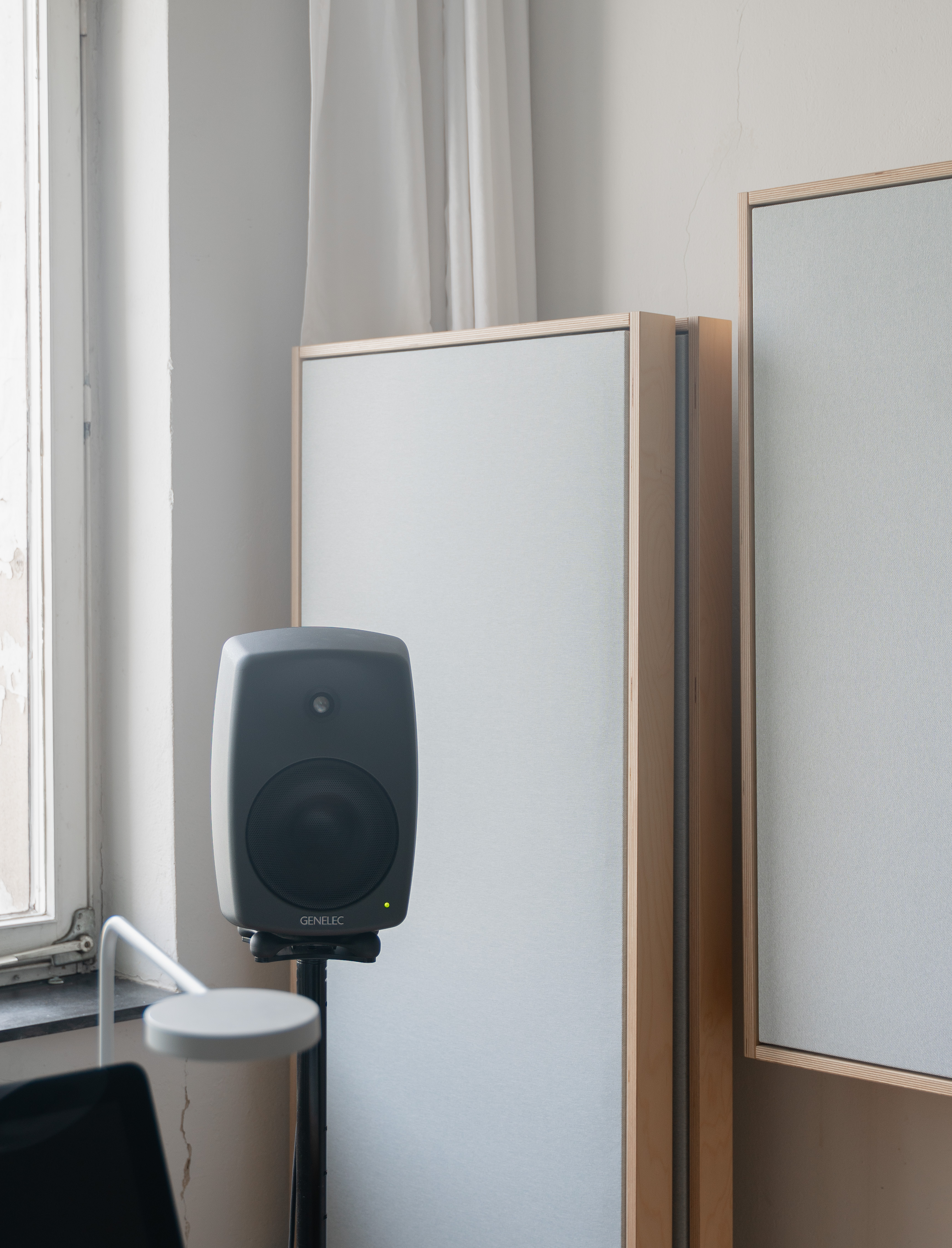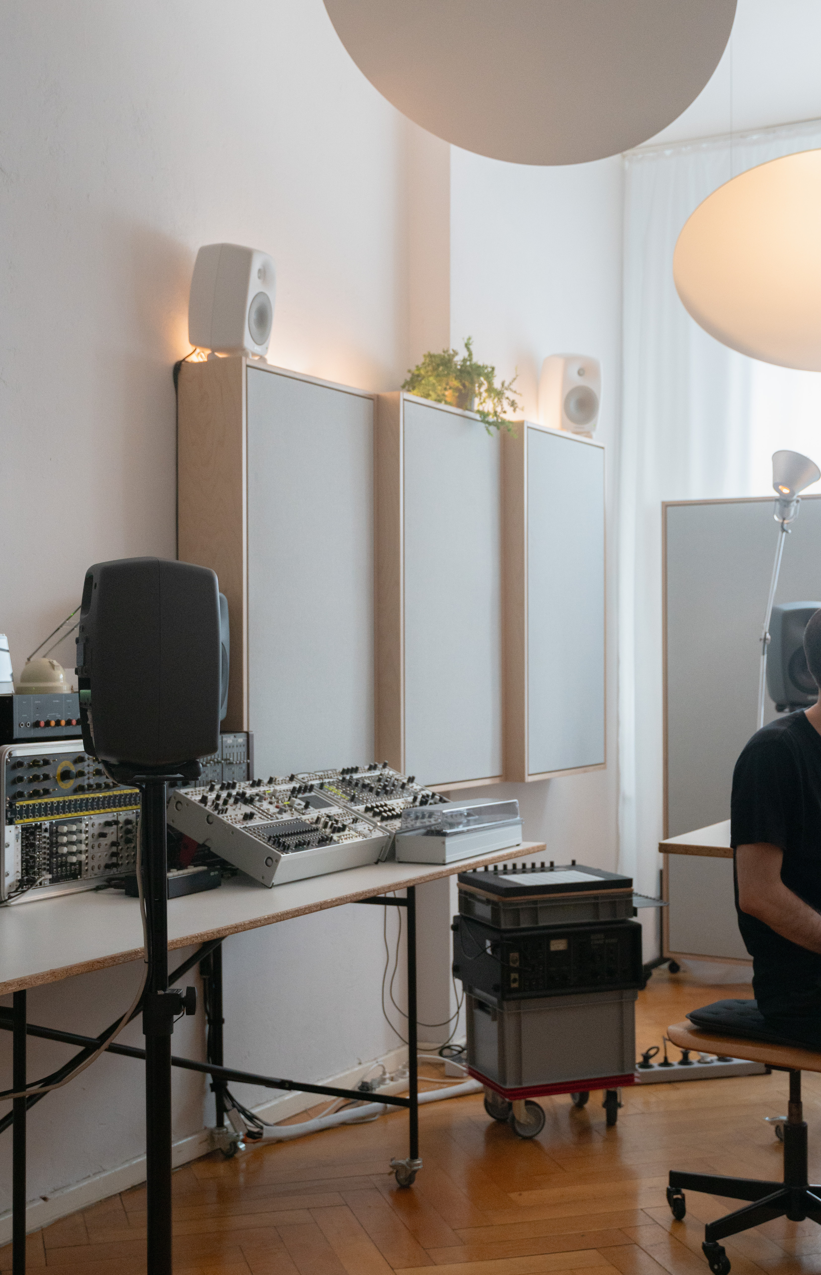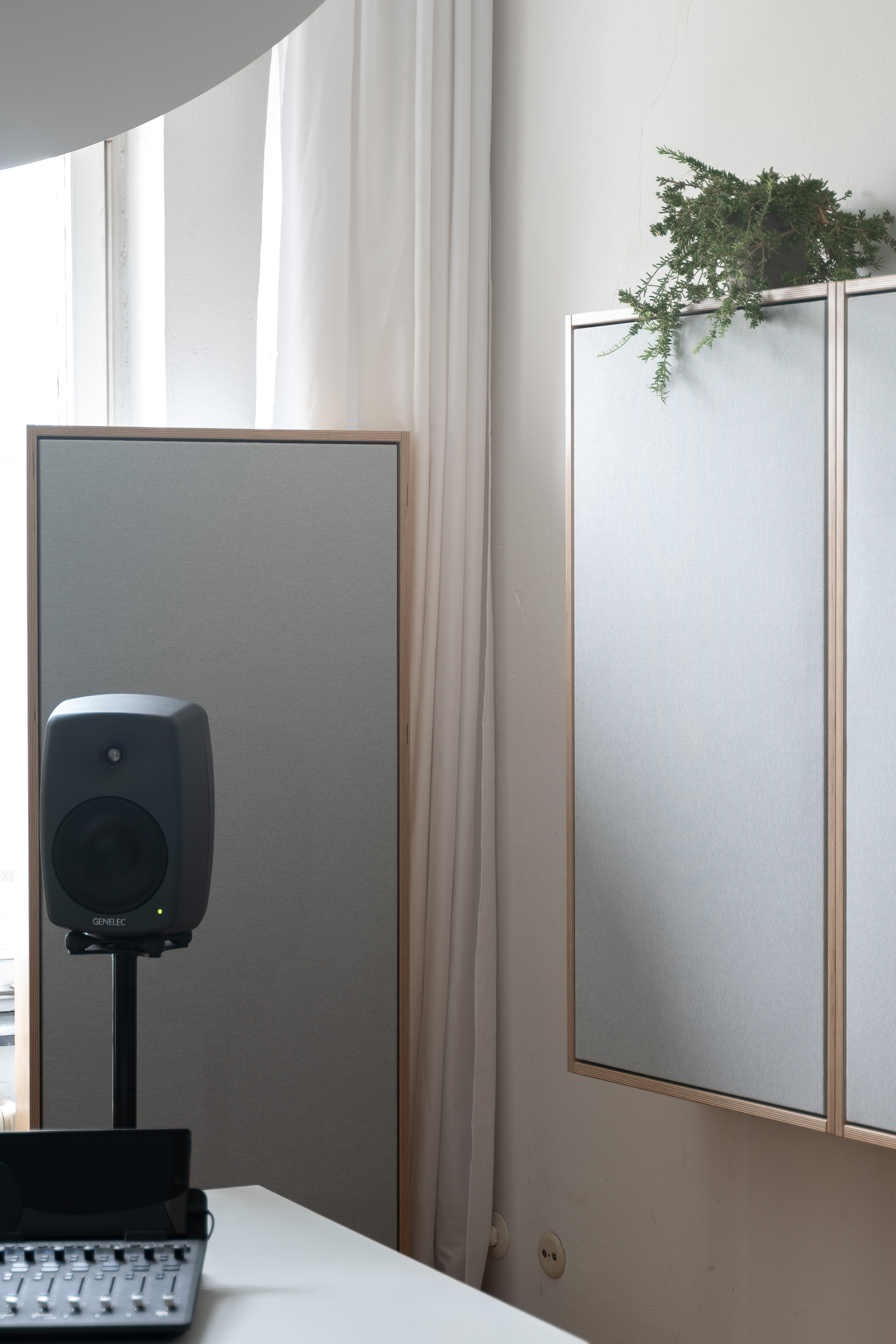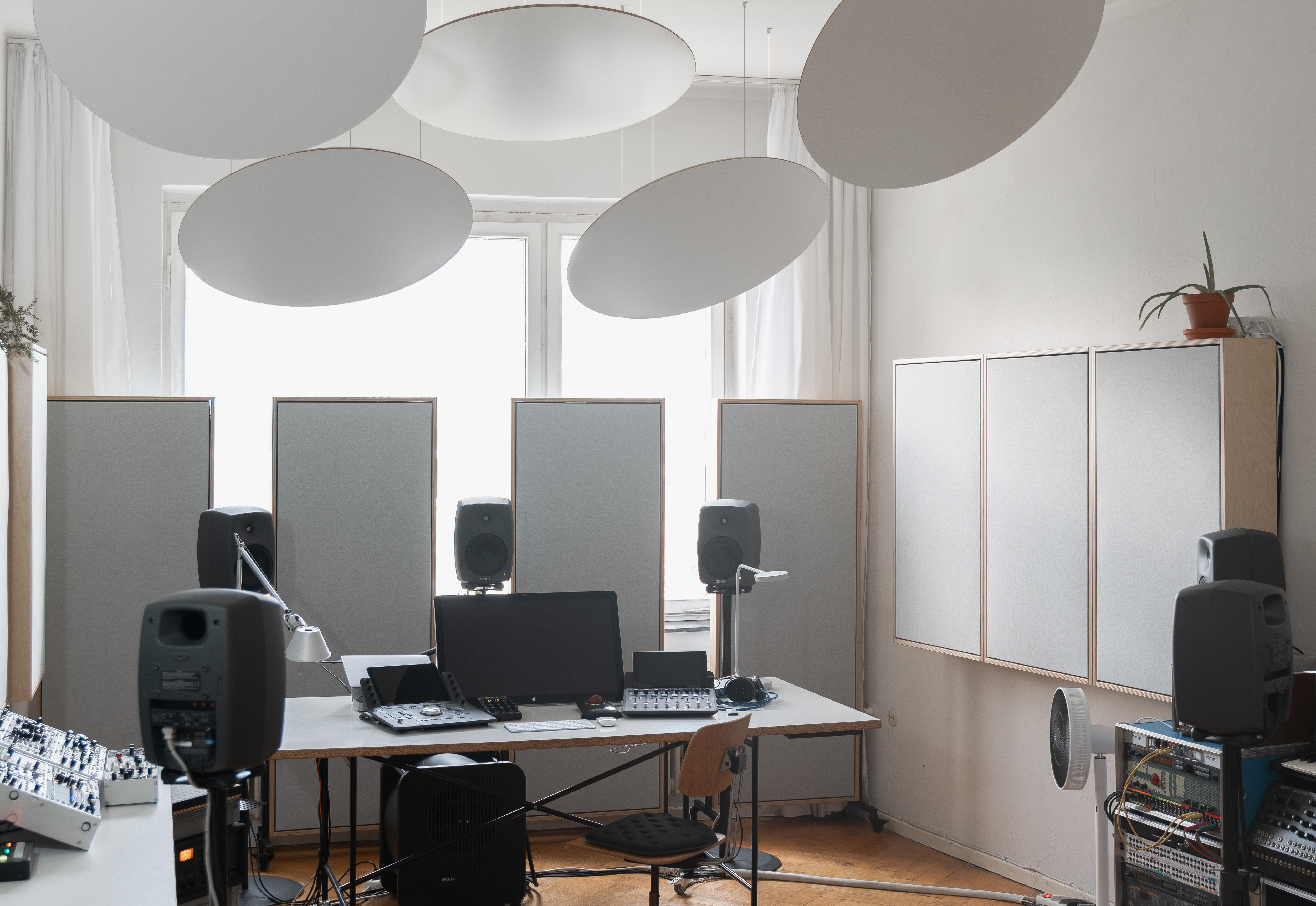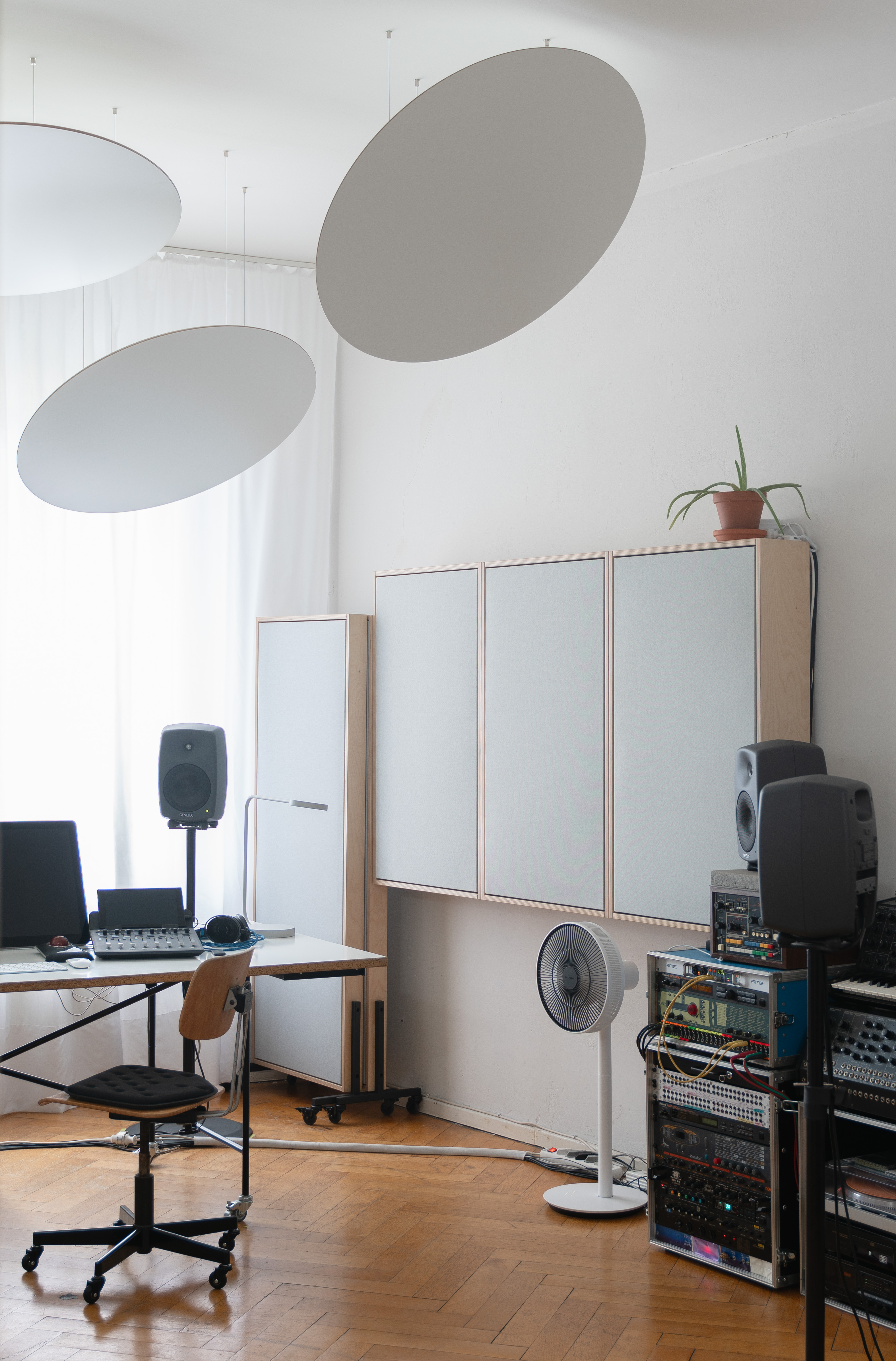 Absorbers on wheels are here designed to allow to switch between optimal listening for stereo and 5.1 setup as well as to create a movable dry environment within the room for vocal recording.